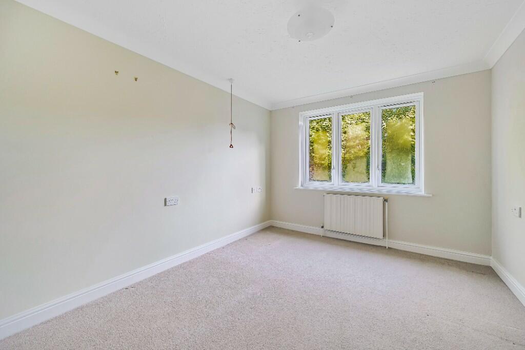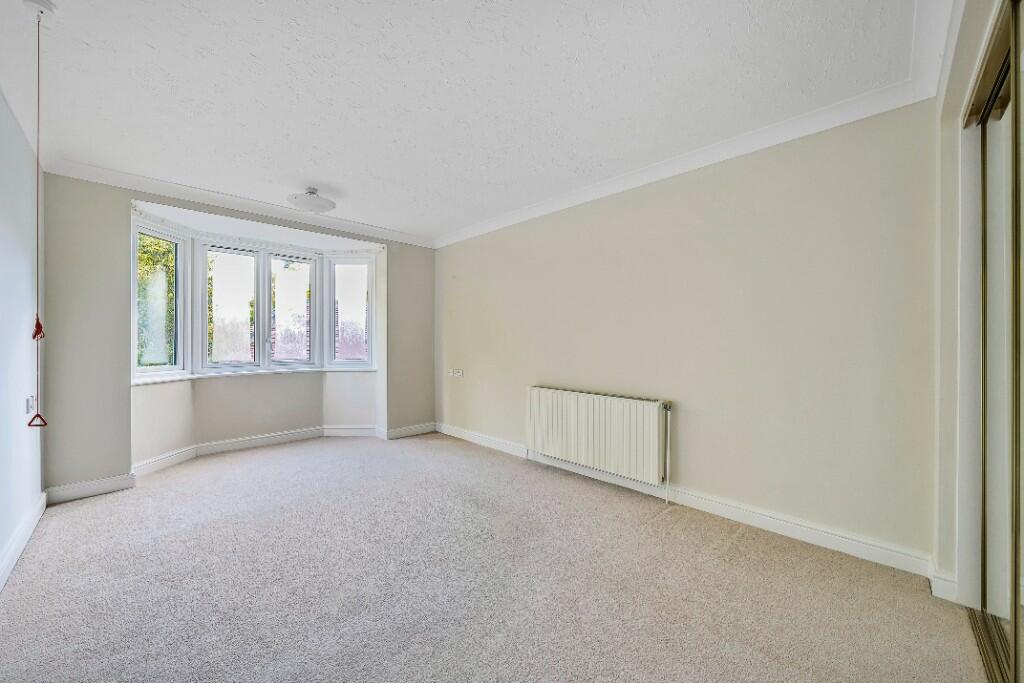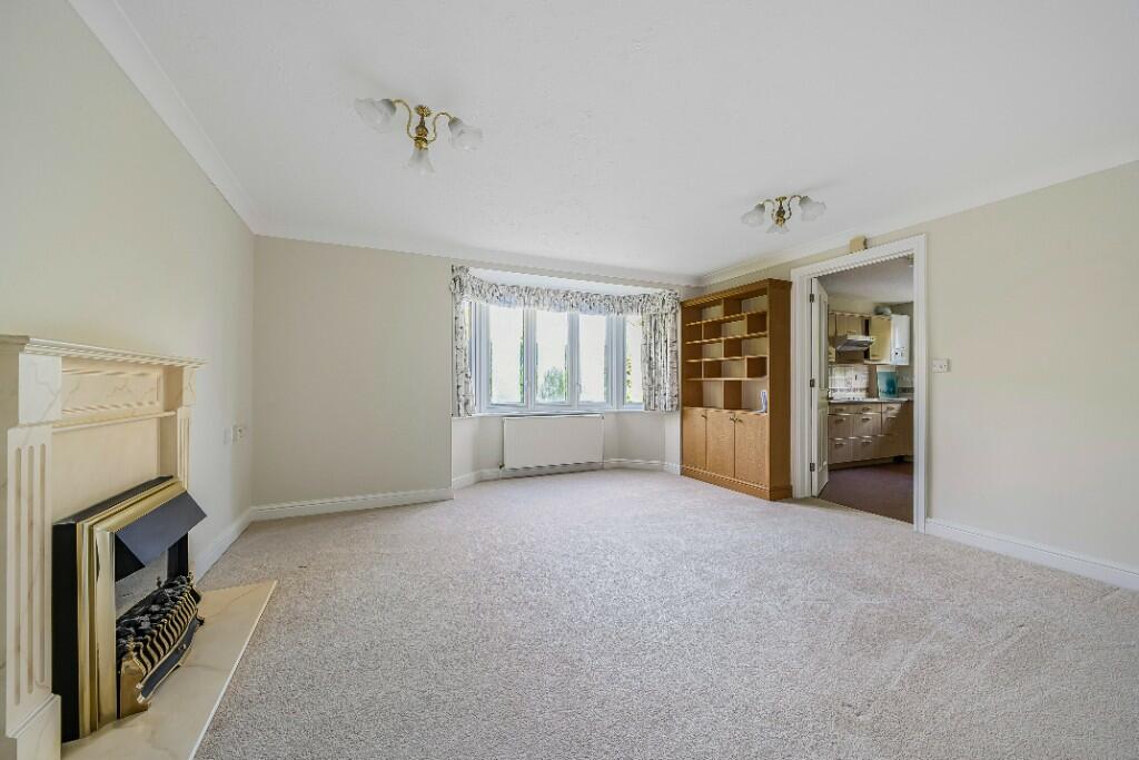A first floor, two bedroom retirement apartment comprising an entrance hall with storage, kitchen with integrated appliances and a useful pantry cupboard, spacious living room with feature fireplace and bay window, modern bathroom with level access shower and bidet, master bedroom with built-in mirrored wardrobes and bay window, plus a second bedroom.